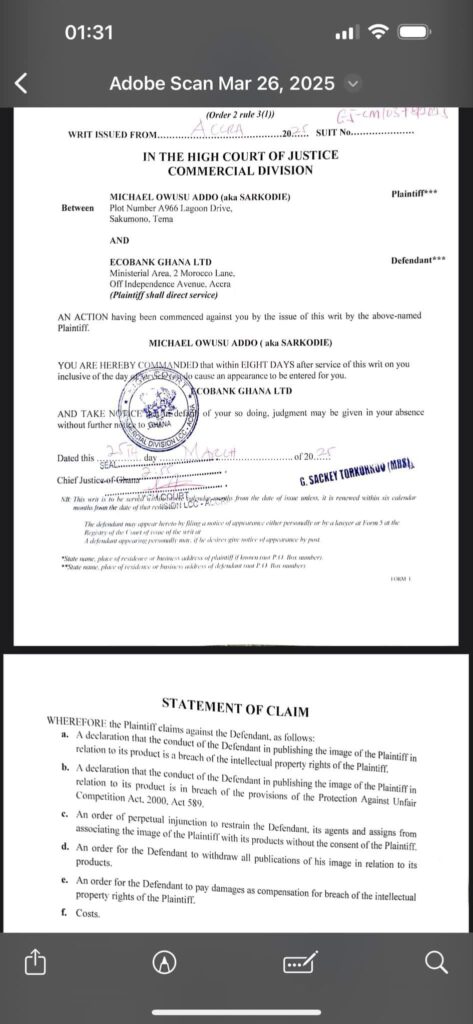 Renowned Ghanaian rapper Michael Owusu Addo, popularly known as Sarkodie, has filed a lawsuit against Ecobank Ghana Limited at the High Court, Commercial Division, in Accra. The writ, issued on March 26, 2025, alleges that the bank unlawfully used his image in promotional materials without his consent.