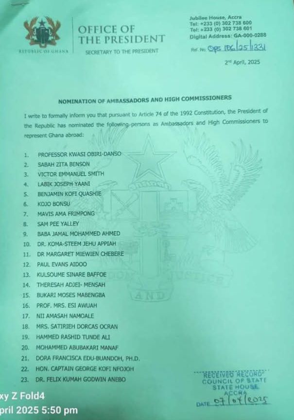 President John Dramani Mahama has appointed twenty-three (23) Ambassadors and High Commissioners to represent Ghana abroad.