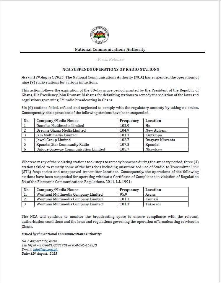 In a sweeping regulatory crackdown, the National Communications Authority (NCA) has yanked nine radio stations off the air for breaching broadcasting laws.