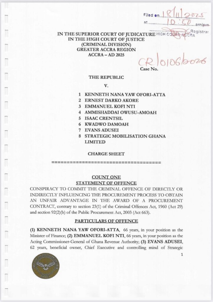 The case, titled The Republic v. Kenneth Ofori-Atta & 7 Others, has been filed at the Criminal Division of the High Court.