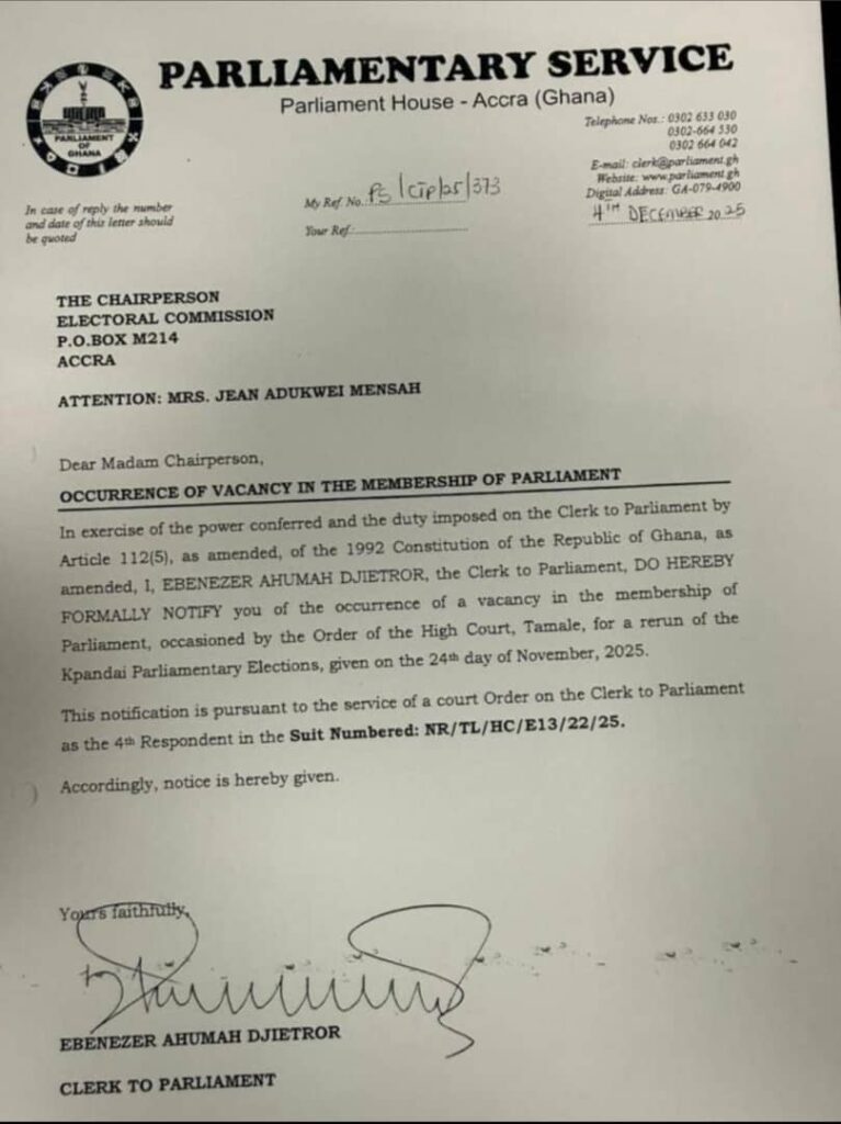 This was communicated in an official letter from the Clerk to Parliament, Mr Ebenezer Ahimah Djietror, to the Chairperson of the Electoral Commission (EC), in compliance with constitutional provisions governing parliamentary vacancies.