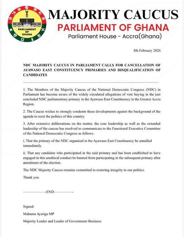 In a statement dated February 8, 2026, and signed by Majority Leader and Leader of Government Business, Mahama Ayariga, the Caucus said it had taken note of widespread allegations of vote buying during the recently held primary in the Greater Accra Region.